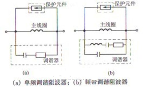 线路阻波器一般由电感型主线圈,调谐器以及保护元件构成,直接串接在高压输电线中载波信号连接点与相临的电力系统元件之间,来防止传输于外界电力线的信号干扰。阻波器按电路谐调方式分类,主要分单双频,频带及无调谐,图4为单频调和频带调谐阻波器电路图。