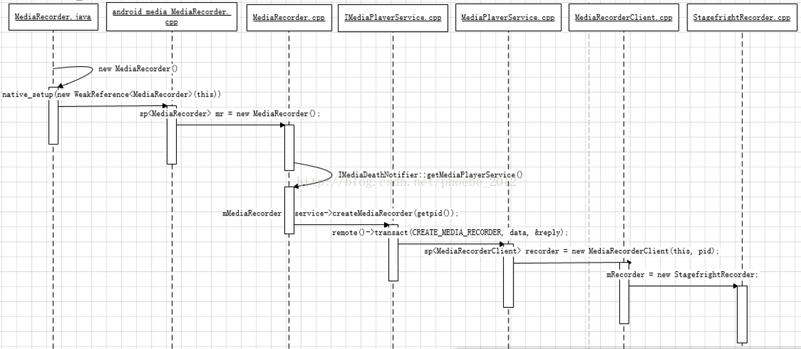 (3)继而调用mediarecorder.cpp的构造函数,它首先会从ServiceManager中获得MediaPlayerService服务,然后通过服务来创建recorder。这个recorder就是录音的真实实例。