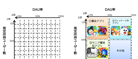 首先给大家解释一下App Ape此次统计所采用的方法。说是复合,实际上App Ape选取了手游产品的“用户数量”和“DAU率”来搭建一个直角坐标系(数据均来自App Ape),根据产品在直角坐标系中的位置来对其进行分类。下图中横轴为“DAU率”、纵轴为“估测用户数量”(这里App Ape有一个标注错误,图上越往左上角数值越大,越往右下角数值越小)。
