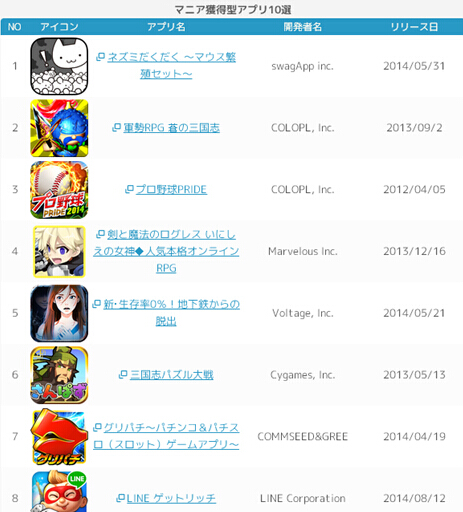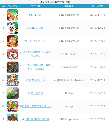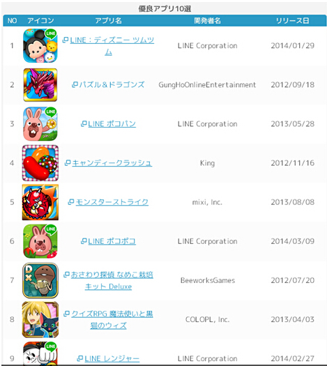 第1~5位的产品依次是:《LINE POP》、《LINE 泡泡龙》、《LINE 跑跑姜饼人》、《妖怪体操第一》、《怪物弹珠》、《触摸侦探 滑子菇栽培 Seasons》