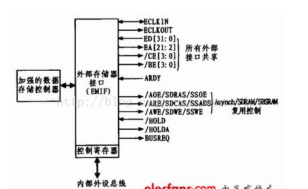 EMIF,全称是External Memory Intece,外部存储器接口,用于片外储存器扩展和外部数据接口的一种并行数据传输片上外设。它能与三种外部存储器无缝连接:同步突发静态存储器(SBSRAM),同步动态存储器(SDRAM),异步存储器(SRAM,ROM,FLASH)等。