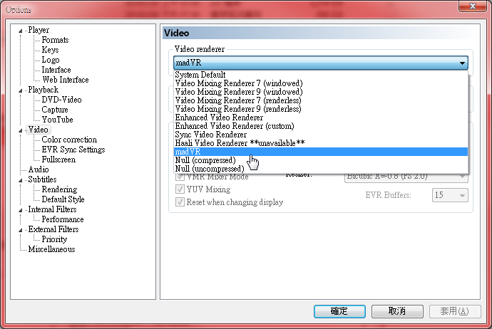 到MPC-BE裡的選項>視訊底下應該可以選擇madVR了