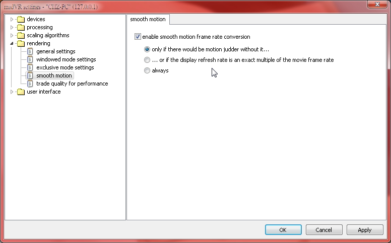 Reclock難以處理的非整數倍的同步問題,像最常見的24fps(23.976)影片在60Hz螢幕上播放,就很適合讓madVR的smooth motion FRC功能來解決,把這功能打開會發現影像的judder都消失了,就有如同步播放時的那種流暢感。