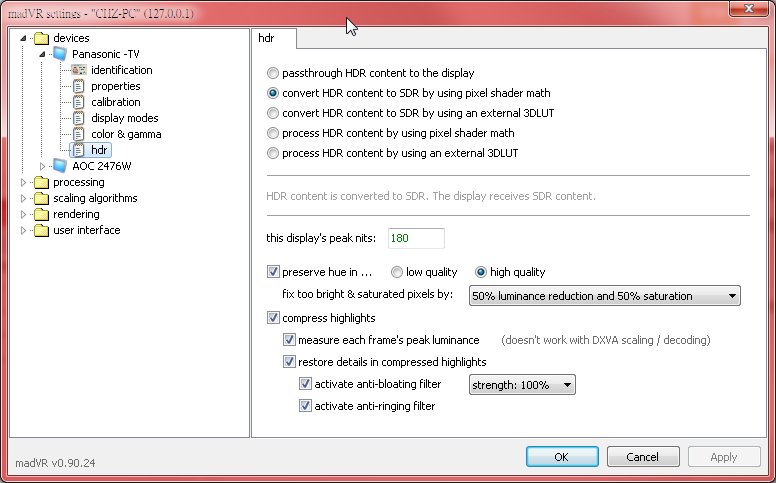 "process HDR content by using pixel shader math",選擇此選項螢幕必須支援HDR播放,但是是由madVR來處理色域跟亮度的轉換,例如電視支援HDR,但是色域是DCI-P3的case。(calibration裡的3DLUT檔會繞過)