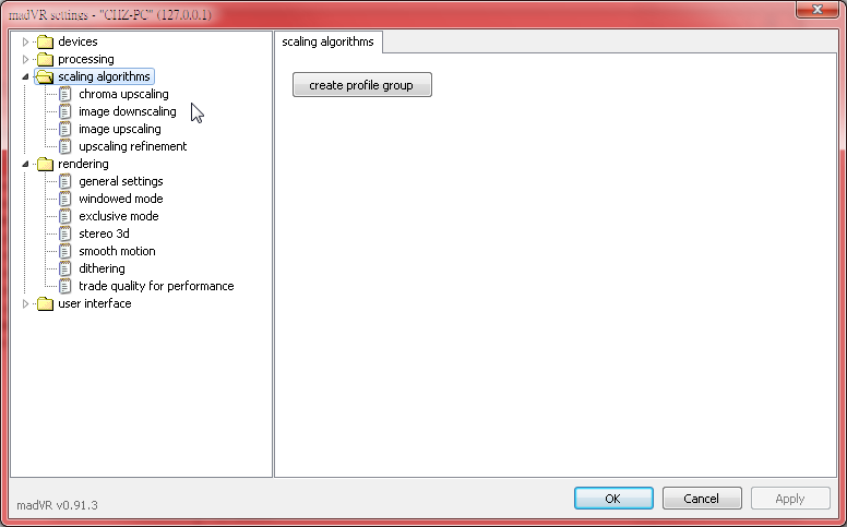 接下來要進入重頭戲,關於scaling演算法的設置,這部分是影響效能最大也是影響畫質表現最明顯的地方,也是madVR的最大特色,我們可以看到有四個地方需要設置演算法,分別是chroma upscaling、image downscaling、image upscaling和upscaling refinement
