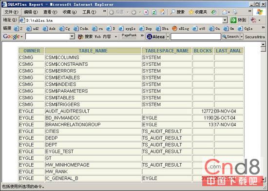 把main.sql脚本中的,spool tables.xls更改为spool tables.htm,我们可以获得htm格式输出,效果如下图: