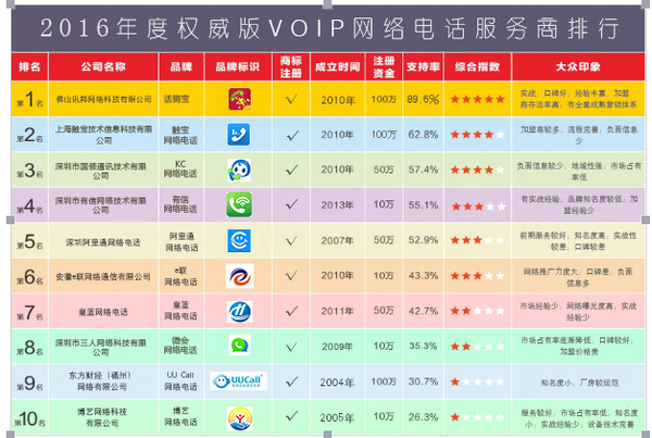 在近年的即时通讯的高速发展,被认为是移动通讯必备配套产品手机网络电话,从2014年的诞生到2015年飞速发展,其倍受中小投资创业者青睐!且具有新兴的行业、市场潜力巨大、区域分布广等特点,总会有一些以次充好的“山寨”、三无产品及非正规公司坑害创业者的市场乱象层出不穷。为了VOIP网络电话市场的“光明”,为了创业者和消费者能有最新最权威的参考,经多方实地调查考证,数万热心消费者和VOIP网络电话行业投资者积极参与,本着公正,公平,公开的原则,评出2016年中国网络电话服务商十大品牌排行榜。